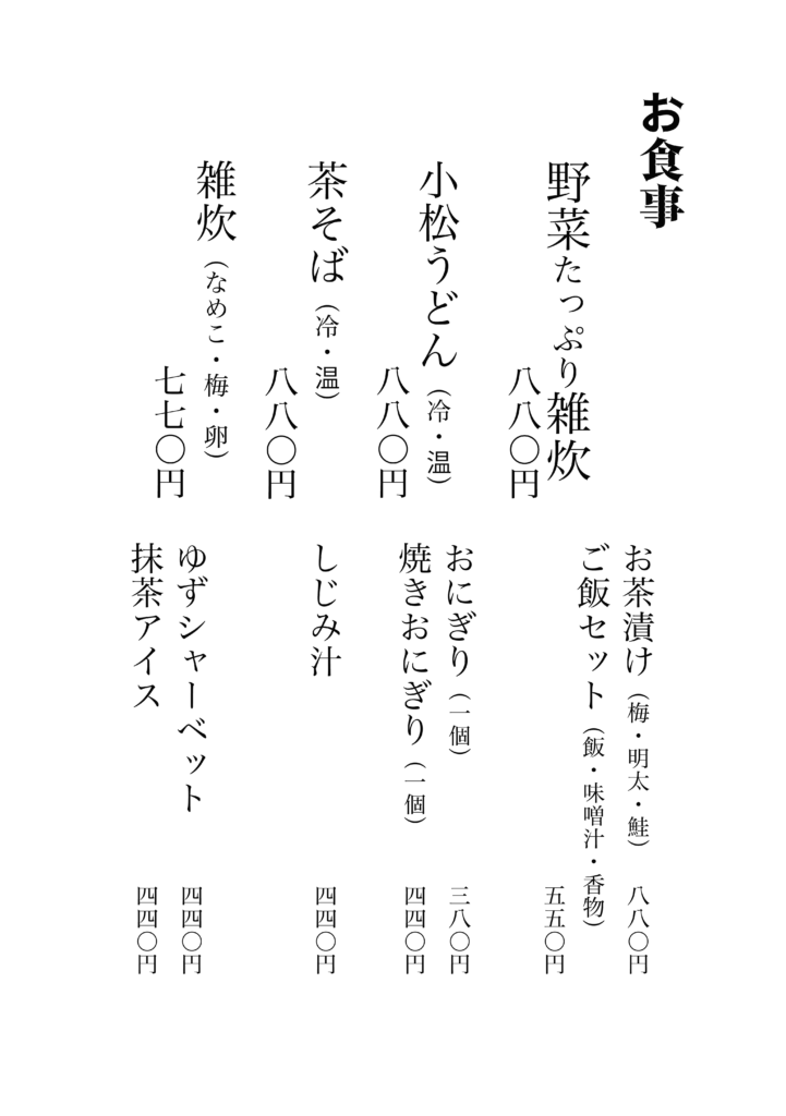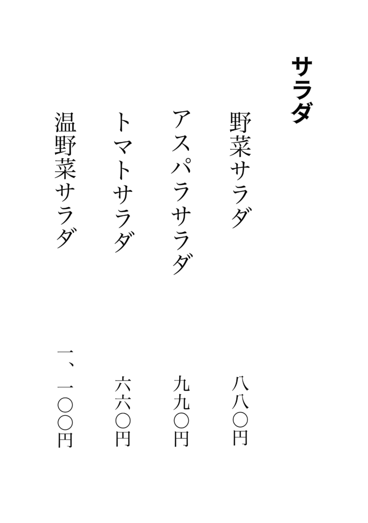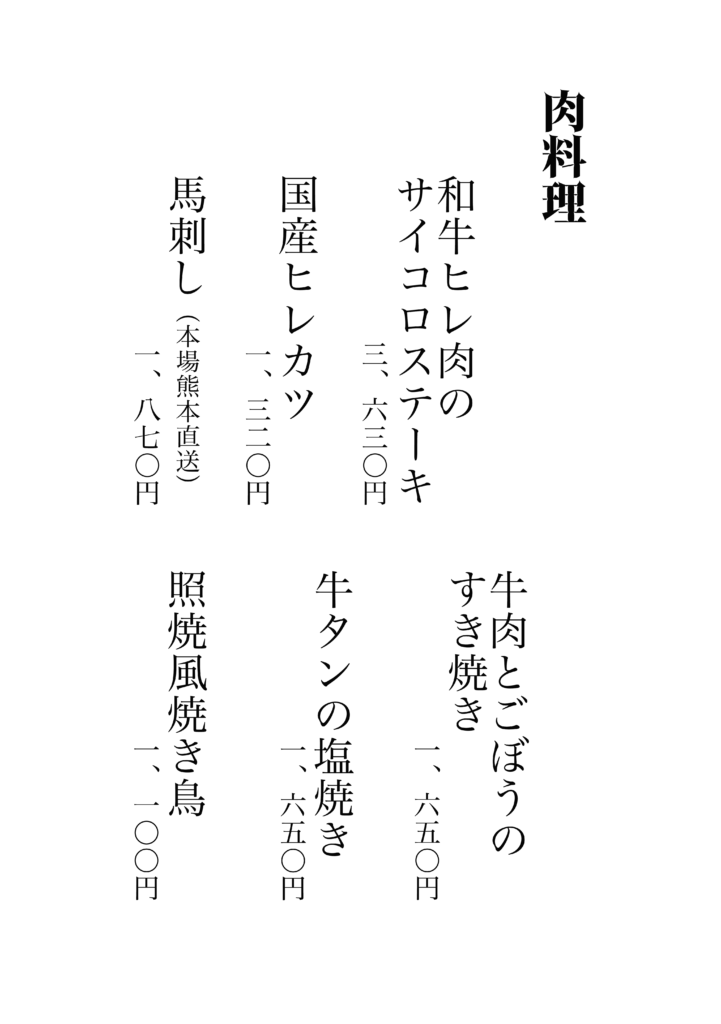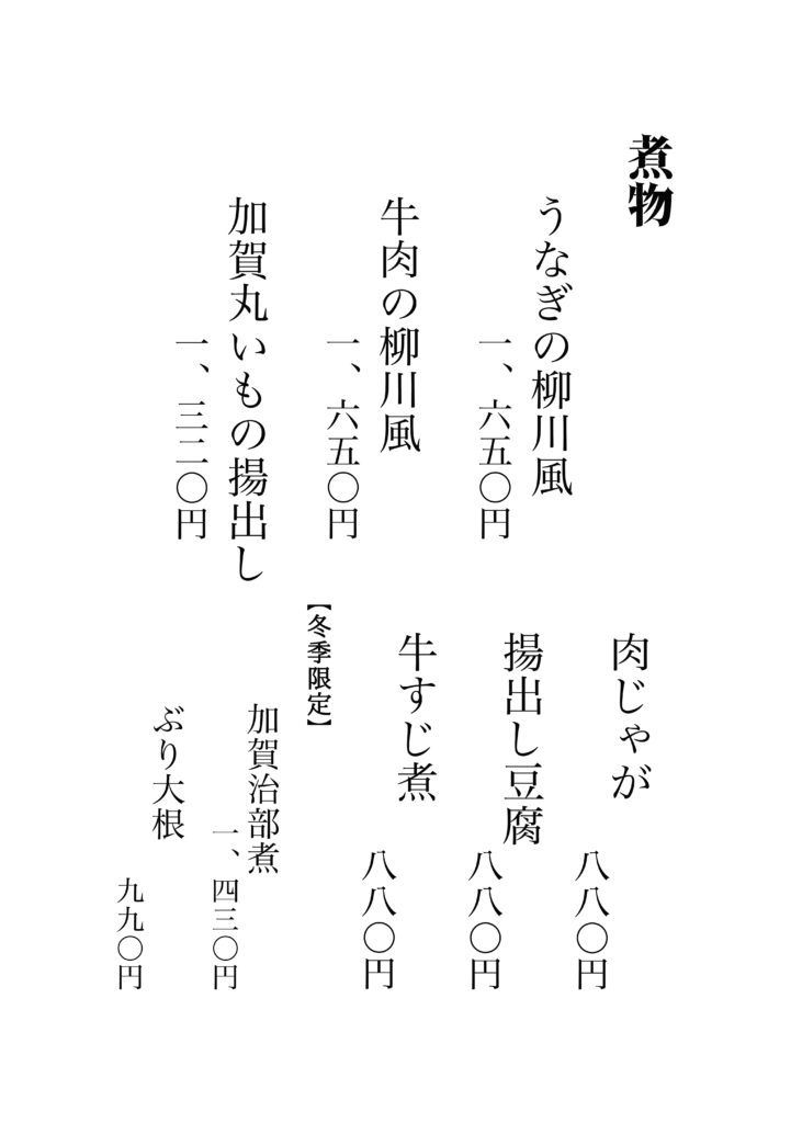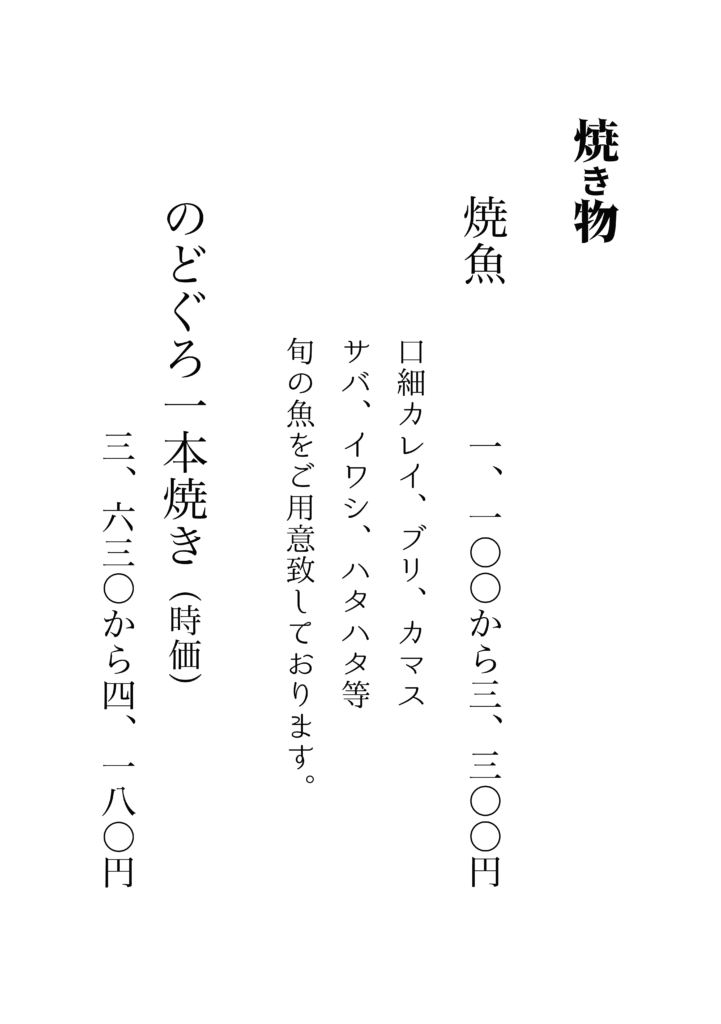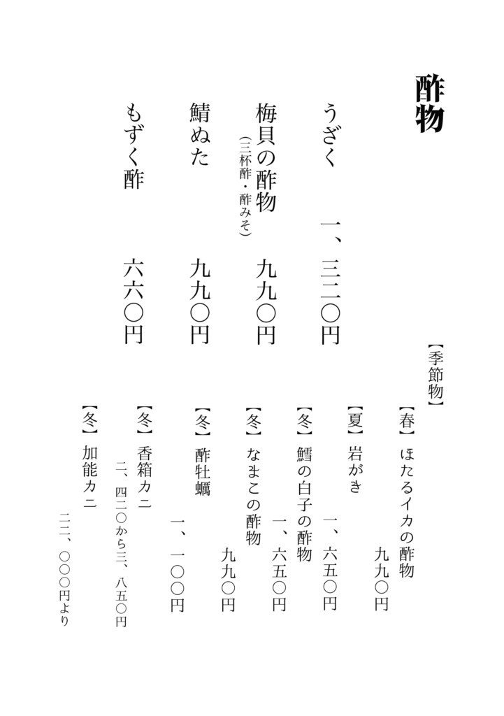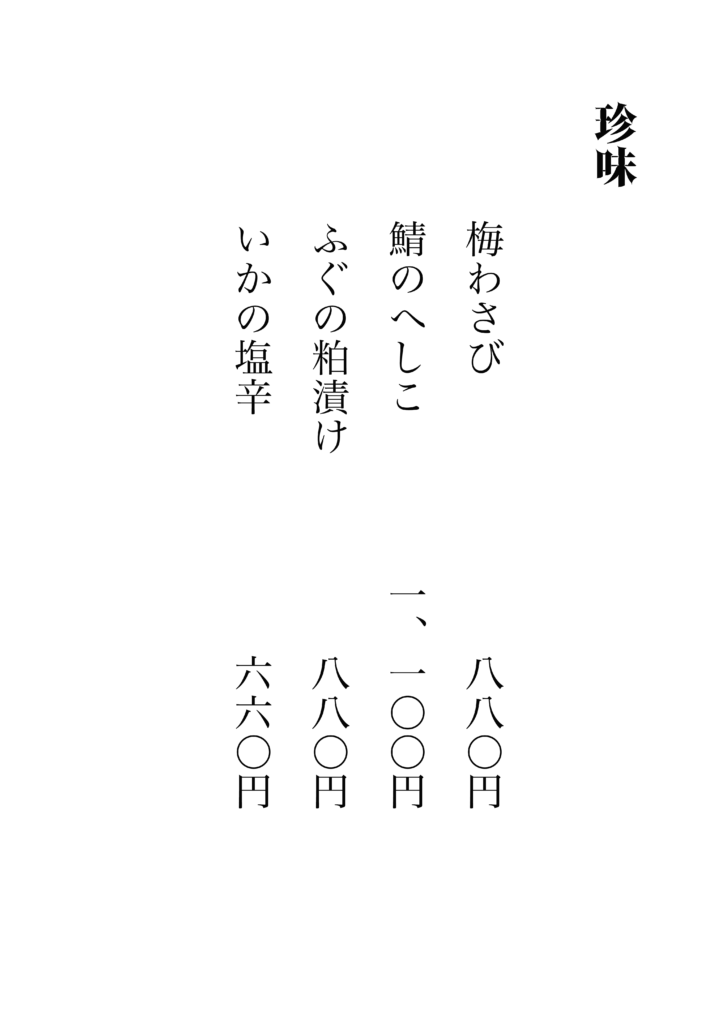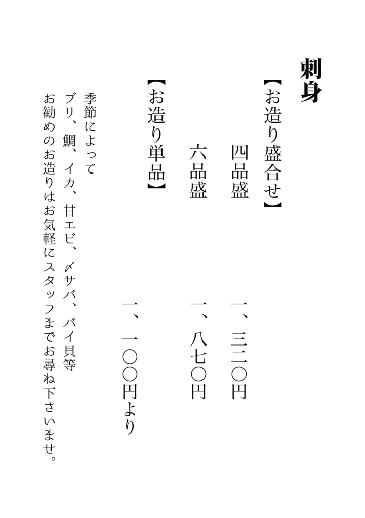 <価格表記は全て外税です> 刺し身 焼き物 酢物 サラダ 煮物 肉料理 揚げ物 一品料理 珍味 お食事 →ランチメニューはこちらから← ■刺し身■ ■焼き物■ ■酢 物■ ■サラダ■ ■煮 物■ ■肉料理■ ■揚げ物■ ■一品料理■ ■珍 味■ ■お食事■